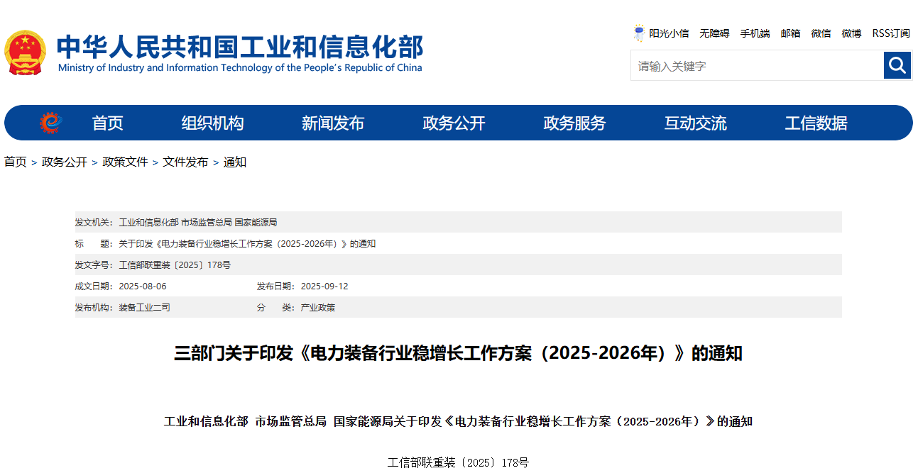¹¤ÐŲ¿Ðû²¼¡¶µçÁ¦×°±¸ÐÐÒµÎÈÔöÌíÊÂÇ鼯»®£¨2025-2026Ä꣩¡·